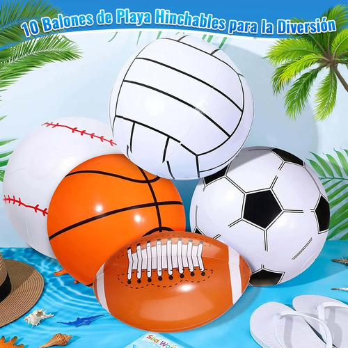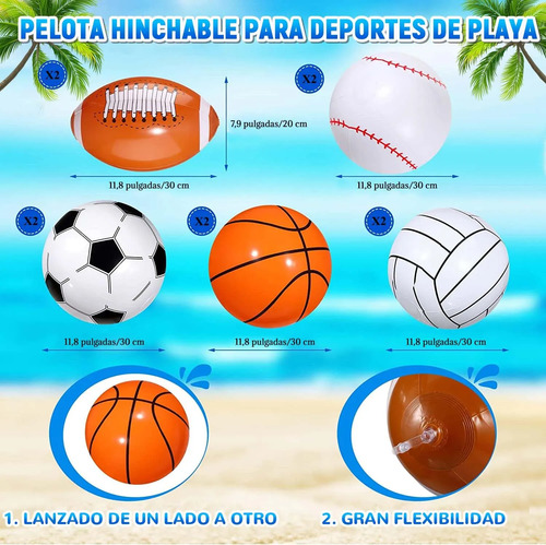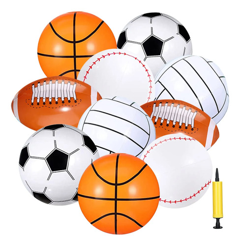 Varios EstilosUsted recibirá 10 pelotas de playa inflables en 5 estilos, divididos en rugby, béisbol, baloncesto, fútbol y voleibol, cada uno con 2 bolas, viene con una bomba de mano. Una buena combinación para satisfacer sus diversas necesidades y mantenerlo relajado