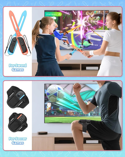 Juego de movimiento completo inmersivo: el diseño ergonómico que imita los movimientos reales puede mejorar enormemente la experiencia de juego. Las raquetas mejoran la experiencia deportiva y el realismo. Correas de pierna ajustables para un seguimiento preciso de la pisada en Ring Fit y partidos de fútbol. La pulsera mantiene el controlador estable durante los juegos de danza/fitness. Las calorías se queman en medio de la risa y la alegría.