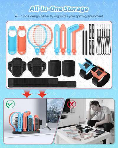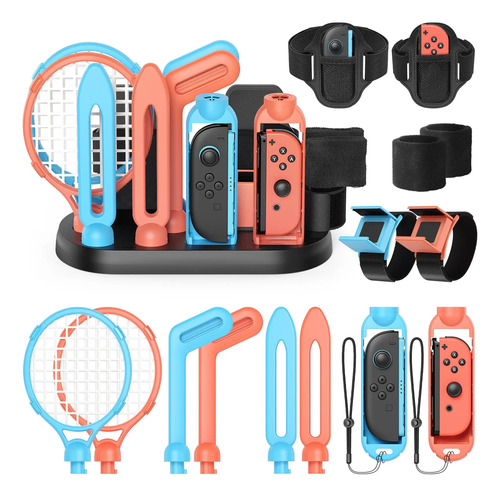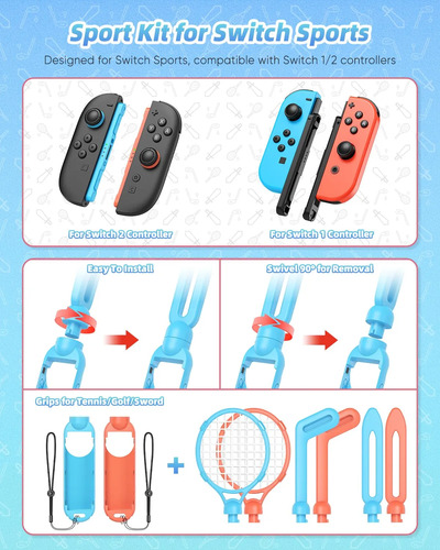 Paquete de accesorios deportivos 19 en 1: este juego de accesorios para Nintendo Switch 2 (2025) y Nintendo Switch (2017) / Switch OLED contiene: 2 raquetas de tenis/bádminton para Mario Tennis Fever 2 clubes de golf 2 espadas Chambara 2 x bolsillos para las correas de las piernas 4 x correas de pierna (2 x largas 23 pulgadas / 58 pulgadas). .4 cm, 2 Corto 16 pulgadas / 40,6 cm) 2 x pulseras 2 x pulseras de transpiración 2 x mango común 1 x muelle de almacenamiento 4 x dispositivos compatibles para todos los accesorios.