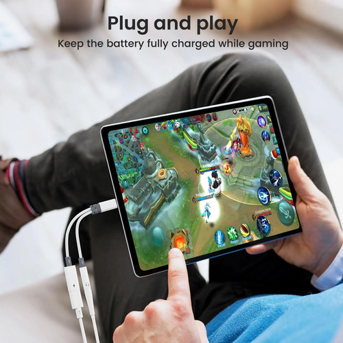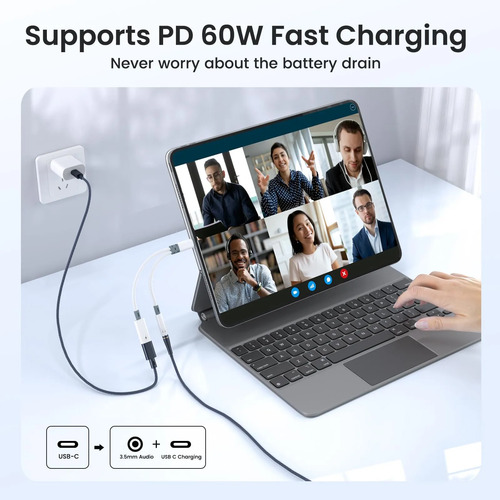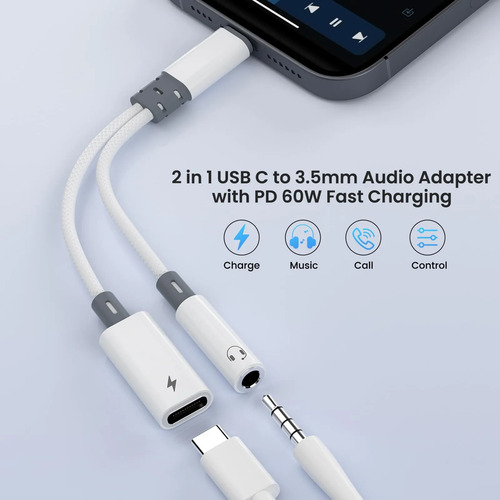 Adaptador 2 en 1: divide su puerto USB-C en un puerto USB-C compatible con PD y un conector de audio de 3,5 mm, lo que le permite escuchar música, jugar, llamar o ver videos mientras carga rápidamente su dispositivo. Nota: No es compatible con la transferencia de datos