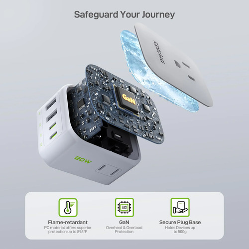 Carga rápida: este adaptador de enchufe de viaje agregó 2 USB C que aprueba la carga rápida. Tanto USB C como USB A pueden cargar a 5 V/3 A y un total de 20 W máximo, lo que es un 30 % más rápido que otros adaptadores de viaje.