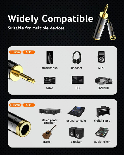 Pure copper connectors resist corrosion and ensure minimal signal — of pure copper and its service life is much longer than plastic and gold plating.100% Lifetime warranty,and friend customer service.Handy and portable, widely work with earphone, headphone, karaoke system and etcWork for for 3.5mm jack equipment,Connect 3.5mm Male to 6.35mm Female1/8 to 1/4 adapter, allows you connect headphones to audio devices