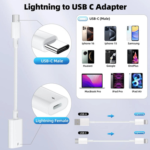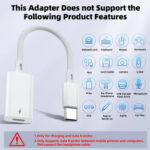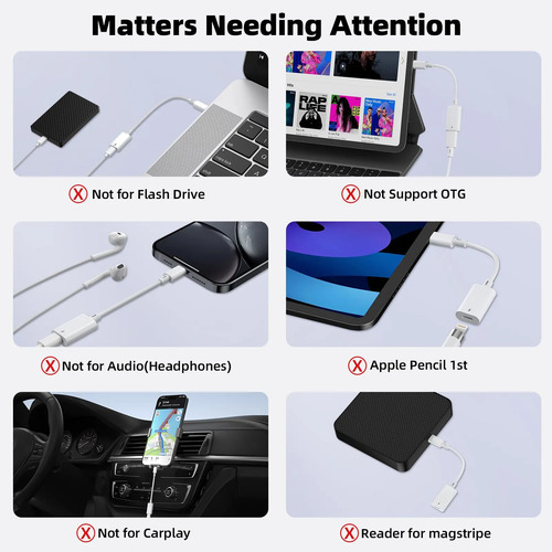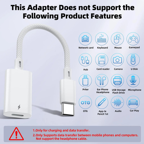 Atención: el adaptador Lightning a USB C puede cargar y sincronizar datos entre tu teléfono y computadora no es compatible con funciones OTG de video y audio, auriculares, no para Apple Pencil (1a generación), mouse, teclado, unidad flash, lector de tarjetas, impresora, micrófono, cámara, etc