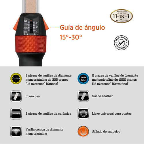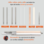 á: El diseño intuitivo permite una fácil configuración y reemplazo de los abrasivos de afilado, incluyendo varillas de diamante monocristalino, varillas de cerámica y varillas cónicas, para satisfacer mejor sus necesidades de afilado.