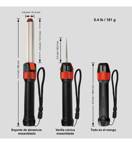 ó : El soporte de los abrasivos puede desmontarse y almacenarse dentro del mango, haciendo que el afilador sea compacto y portátil sin comprometer su funcionalidad.