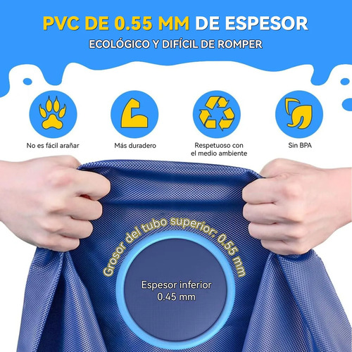 Más Gruesa y DuraderaLa piscina para perros tiene un grosor de 0,55 mm, lo que la hace más duradera que las piscinas de 0,25 mm, garantizando un juego seguro para mascotas y niños. Nota: Recorte las uñas de su mascota antes de usarla.