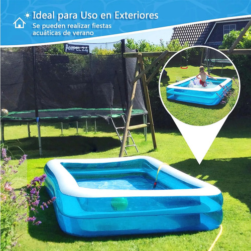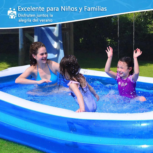 Gran área de juegosEsta piscina inflable mide 262x175x50cm, espacio suficiente para alojar cómodamente a 4 adultos o 4 niños. La piscina perfecta en el patio trasero para que los niños chapoteen, los adultos se relajen y las peleas acuáticas familiares.