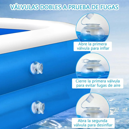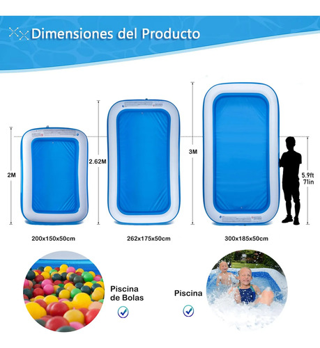 Fácil de guardarLa bolsa de aire se infla en 4-5 minutos con una bomba eléctrica (no incluida). El drenaje inferior permite un fácil drenaje cuando está listo para el almacenamiento. Deje que el sol seque las zonas húmedas y luego la piscina infantil se puede plegar para guardarla de forma compacta.