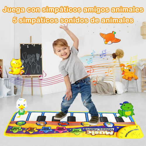 Múltiples modos Este alfombrilla musicalesl de piano para niños puede entrenar el desarrollo auditivo de los niños y los colores brillantes pueden estimular el desarrollo visual de los niños. Este alfombrilla musicalesl de piano para niños incluye 5 sonidos de animales (pato, gatito, pájaro, cachorro, rana) y 13 teclas (8 teclas blancas y 5 teclas negras) para satisfacer las necesidades divertidas de los niños.