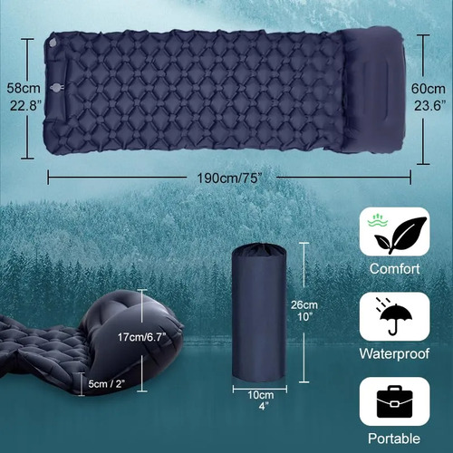 Ligero y Portátil Nuestro colchón inflable para exteriores mide 190 cm x 60 cm x 5 cm, ideal para la mayoría de las personas. Su tamaño de almacenamiento es de solo 26 cm x 10 cm, y pesa apenas 500 g, lo que lo hace extremadamente fácil de transportar en cualquier viaje, perfecto para mochileros y amantes del camping. Incluye una bolsa de almacenamiento compacta para transportarlo fácilmente sin ocupar mucho espacio en tu mochila.