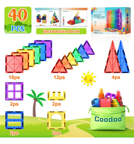 Gran juego de azulejos magnéticos: fomenta el aprendizaje y la creatividad STEM con el paquete de iniciación de azulejos magnéticos Coodoo Este paquete cuenta con 40 azulejos magnéticos en una variedad de formas y colores arcoíris. Es la opción perfecta para comenzar tu colección de azulejos magnéticos, construir a lo grande y ganar confianza en el juego de azulejos magnéticos. Se incluye una bolsa de transporte para un almacenamiento fácil y sin estrés. También permite a los niños llevar los azulejos de aprendizaje con ellos fácilmente de una habitación a otra.