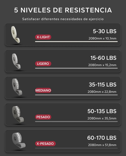 5 piezas con niveles de resistencia variablesNuestros bandas de asistencia para tracción vienen con 5 niveles de resistencia, que aumentan en capas, y puedes cambiar las combinaciones libremente. X-LIGHT: 5-30 libras, luz: 15-60 libras, mediano: 35-10 libras, resistente: 50-140 libras, X-PESADA: 60-170 libras. Los colores de gradiente gris vanguardistas y de moda te brindarán una experiencia completamente diferente en visión y uso.