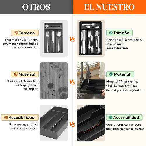 Fácil Uso y Mantenimiento: Diseñado con ranuras curvas para un cómodo acceso a los cubiertos. Su limpieza es sencilla: basta con enjuagar con agua o pasar un paño para eliminar las manchas. Importante: no apto para lavavajillas