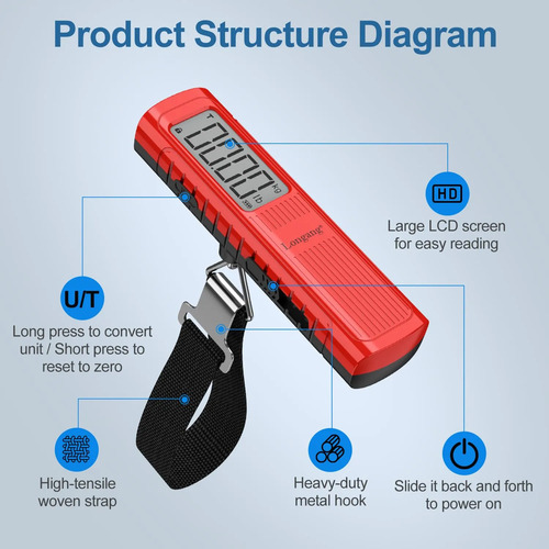 Multifunción: medición precisa, conversión de unidad, advertencia de sobrecarga, función de tara, bloqueo automático de peso, apagado automático. Perfecto para pesar maletas, mochilas, equipo de pesca, paquetes postales y otras necesidades de pesaje en casa o en movimiento.
