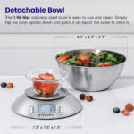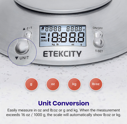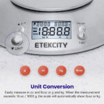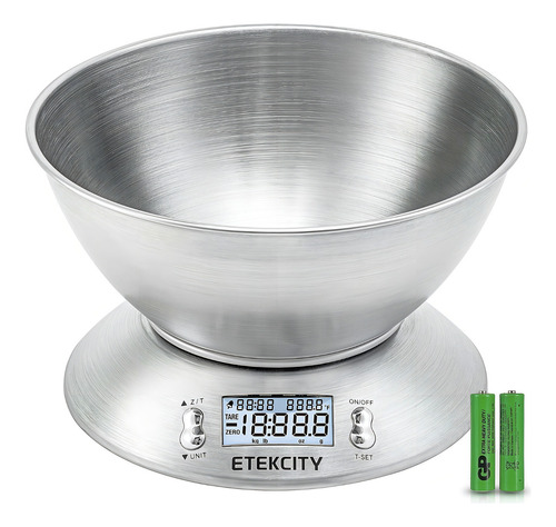 Báscula multifuncional para alimentos Etekcity con recipiente extraíble de 2.15 L para líquidos, temperatura ambiente y temporizador, 5 kg, pantalla LCD retroiluminada