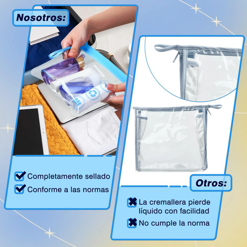 Transparencia y seguridad: Estas bolsas de aseo transparentes te permiten ver fácilmente el contenido, lo que facilita pasar los controles de seguridad en aeropuertos u otros lugares. Además, el material transparente es duradero y resistente a derrames, lo que protege el resto de tus pertenencias en caso de accidentes.