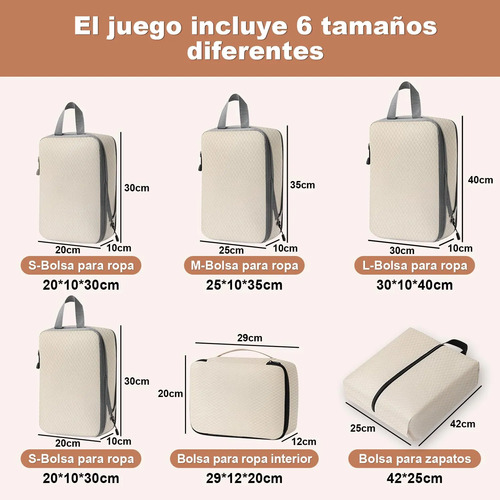 Bolsa Organizador de Viaje para Maletas Compresión, 6pcs Bolsas Organizadora de Equipaje Viaje Accesorios, Impermeable Bolsas para Viaje Organizadoras Packing Cubes, Blanquecino