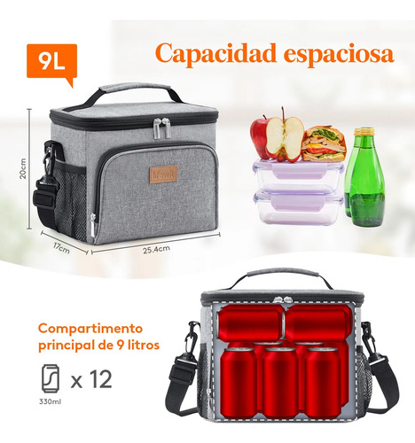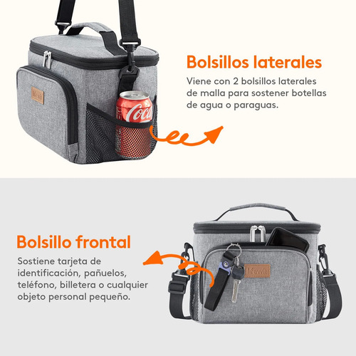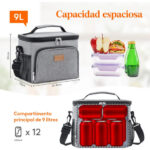 Gran capacidad: Las medidas de esta lunch box son 25,4 cm x 17 cm x 20 cm. Su capacidad máxima es de 9 L y es lo suficientemente espaciosa como para guardar 12 latas de refresco o cerveza (330 ml). Caben perfectamente 2 fiambreras, aperitivos, fruta e incluso una botella de agua. Además, dispone de bolsillos laterales de malla y uno frontal para mayor comodidad.