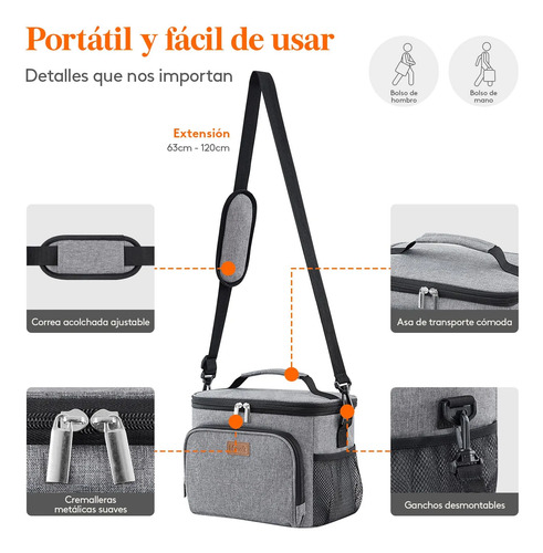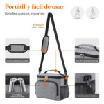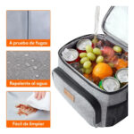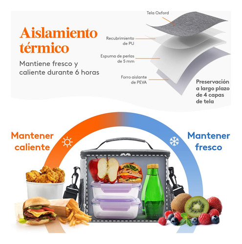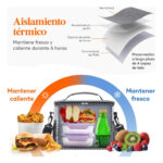 Bolsa isotérmica: Esta bolsa térmica porta alimentos cuenta con un aislamiento cuádruple que conserva los alimentos fríos o calientes durante un máximo de 6 horas. Incorpora un forro fabricado en PEVA, un acolchado de espuma perlada aislante de 5 mm de grosor y un tejido Oxford antidesgarro con revestimiento de PU para una mayor protección.