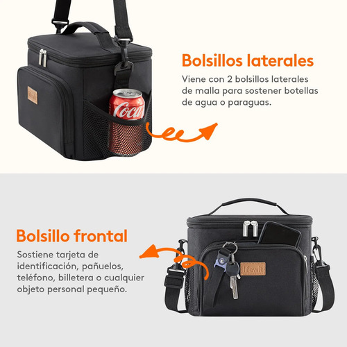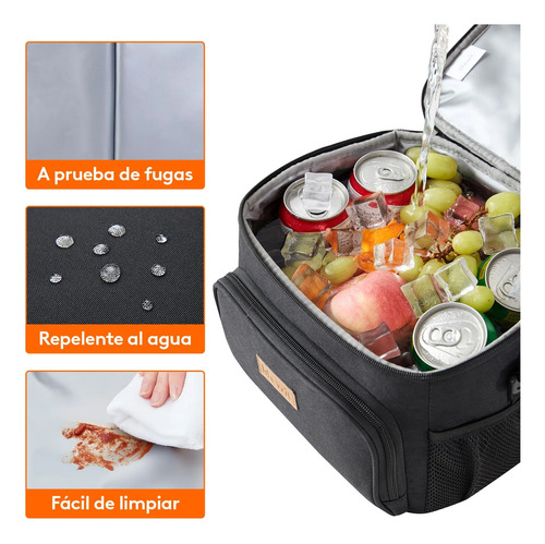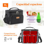 Gran capacidad: Las medidas de esta lunch box son 25,4 cm x 17 cm x 20 cm. Su capacidad máxima es de 9 L y es lo suficientemente espaciosa como para guardar 12 latas de refresco o cerveza (330 ml). Caben perfectamente 2 fiambreras, aperitivos, fruta e incluso una botella de agua. Además, dispone de bolsillos laterales de malla y uno frontal para mayor comodidad.