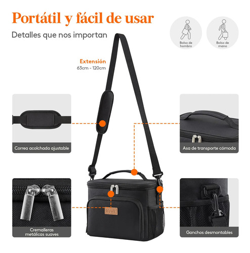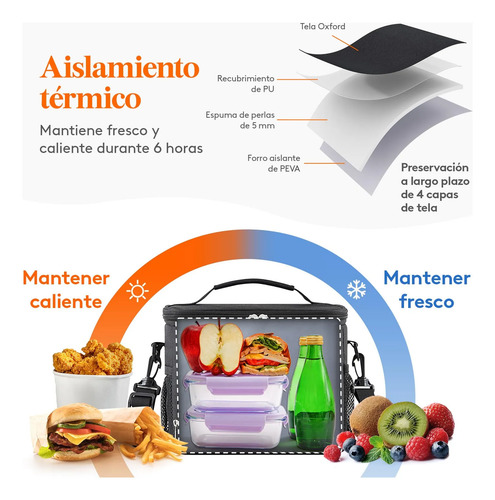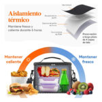 Bolsa isotérmica: Esta bolsa térmica porta alimentos cuenta con un aislamiento cuádruple que conserva los alimentos fríos o calientes durante un máximo de 6 horas. Incorpora un forro fabricado en PEVA, un acolchado de espuma perlada aislante de 5 mm de grosor y un tejido Oxford antidesgarro con revestimiento de PU para una mayor protección.