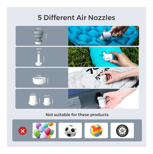 5 boquillas y diferentes usos- Viene con 5 boquillas, nuestro pequeño inflador de aire es adecuado para la mayoría de los productos inflables de tamaño pequeño y grande, como colchones y camas inflables, flotadores de piscina, colchonetas, flotadores de natación, muebles inflables, inflables para alberca y otros juguetes inflables. Hecho de material ABS sólido y con una gran tecnología de sellado, este inflador recargable es resistente, duradero y está bien sellado.