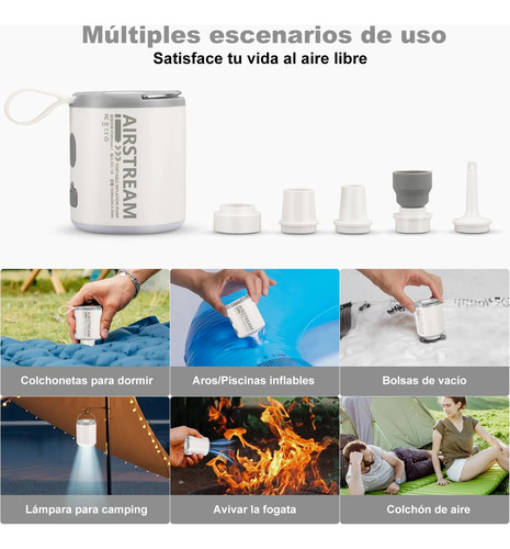Fácil de Usar y Versátil Incluye 5 boquillas diferentes para adaptarse a diversos objetos, desde colchones inflables hasta globos. Gracias a su sist de enfriamiento optimizado, se mantiene fría incluso tras inflar un colchón completo.