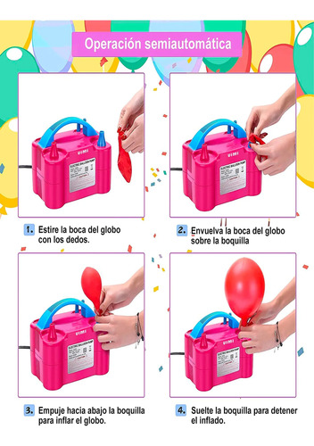 Inflación de 2 Modos: el modo automático está diseñado para un inflado continuo y se opera mediante el encendido / apagado. El modo de presión es adecuado para inflar una pequeña cantidad de globos. Presione ligeramente las boquillas para inflar y luego suelte para detener.