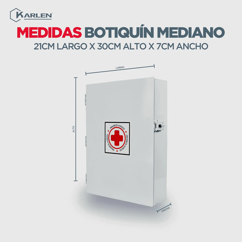 AMPLIO ESPACIO INTERNO 30217 CM Caja rígida y resistente con gran capacidad para guardar gasas, vendas, medicamentos, tijeras, antisépticos y más.