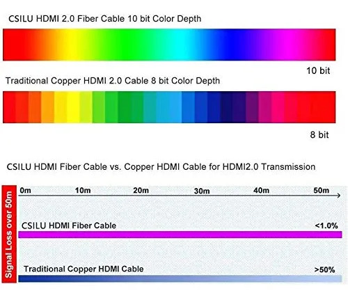 2. Ancho de banda de 18,2 Gbps de alta velocidad: transmisión de larga distancia a 4k HDR 60Hz, la tasa de transmisión de este cable de fibra HDMI 2.0b es más alta que el cable de cobre HDMI común, el cable de cobre HDMI tradicional no puede optimizar muy bien 4K60Hz HDR para larga distancia 33 pies.