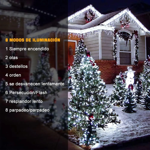 FunciónHay 8 modos para luces de cadena solares impermeables al aire libre: combinación, fluctuación, continuo, lento, persecución / destello, retroceso lento, destello / destello, luz fija