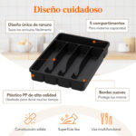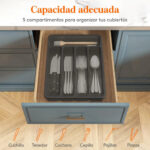 5 compartimentos para organizar: Este organizador de cubiertos tiene cinco compartimentos ideales para almacenar cucharas, tenedores, cuchillos y utensilios, manteniéndolos ordenados y al alcance, facilitando la búsqueda de lo que necesitas.