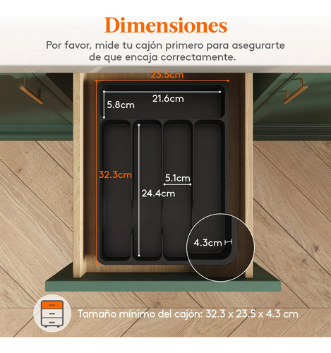 Se adapta a la mayoría de los cajones: Con unas dimensiones de 32.3 x 23.5 x 4.3 cm, este organizador de cubiertos encaja sin esfuerzo en la mayoría de los cajones de cocina, ofreciendo un amplio espacio de almacenamiento. Su diseño ergonómico de ranuras permite una fácil extracción de los cubiertos.