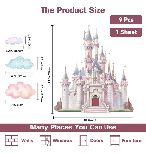 Pegatinas de castillo rosa: esta calcomanía de pared está diseñada en un castillo de princesa, patrones de nubes de fantasía, vívidos y vibrantes, llena de un estilo de cuento de hadas. Despertará la pared lisa o ventana, haciendo que tu habitación sea más acogedora y encantadora.