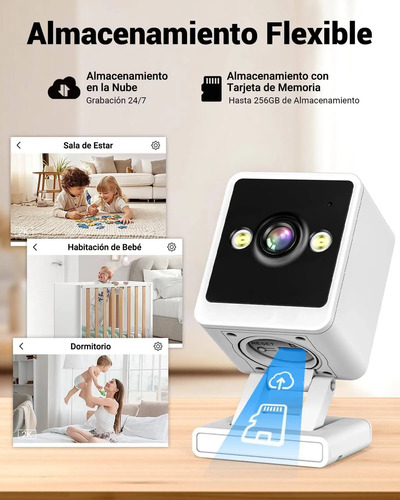 Grabación continua 24/7 Grabación de vídeo continua con una tarjeta MicroSD de 32 GB (se vende por separado). El almacenamiento en la nube puede evitar la pérdida de archivos de la tarjeta SD y garantiza la seguridad de los datos. También es compatible con la conexión en caliente de tarjeta, puede insertar la tarjeta SD después de encender la cámara.