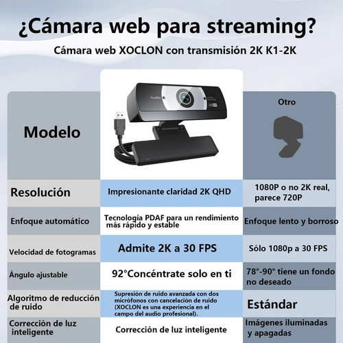 Cámara web 2K para PC con sensor CMOS de 4 MP. Equipada con una lente de imagen de 4 MP y un sensor CMOS, esta cámara web 2K de XOCLON ofrece una resolución 2K QHD (2560×1440) sin falsas interpolaciones, lo que garantiza que cada detalle se capture con precisión cinematográfica. Ideal para reuniones de negocios remotas y aulas virtuales, esta cámara web 2K de XOCLON ofrece a los profesionales una experiencia visual inigualable que acorta distancias, conectando a colegas, estudiantes y público como si estuvieran en la misma sala.