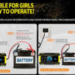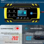 Amplia Gama de UsosEl Cargador de Batería es aplicable a las baterías de plomo- ácido 6-150AH (12V), 6-100AH (24V). Nota: no cargue baterías de litio. Con la tecnología de reparación de pulso de alta y baja frecuencia, puede reparar y activar las baterías con bajo voltaje o sin usar por mucho tiempo. Cargador de batería para coche, camión, motocicleta, cortacésped, barco, SUV, ATV, Excavador.