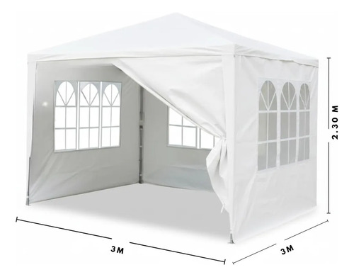 DIMENSIONES DESPLEGADA: Carpa de 3 metros de ancho x 3 metros de profundidad x 2.30 metros de altura, ideal para eventos al aire libre