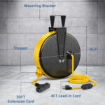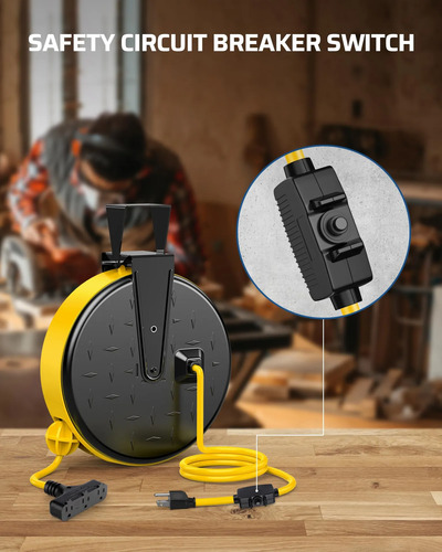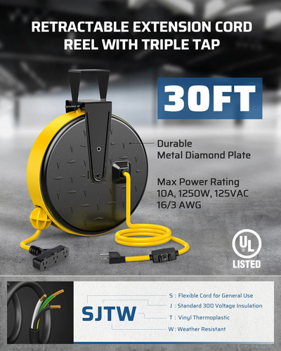 Cable de alimentación de calibre 16/3C de 30 pies y cable de entrada de 4 pies: clasificado para 10 A/125 V/1250 W, la estación de alimentación del carrete de cable eléctrico tiene un cable de extensión SJTW de 30 pies de largo y un cable de entrada de 4 pies el tope no es ajustable, lo que puede evitar eficazmente que el cable de extensión se retraiga completamente en el carrete