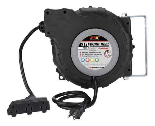 Performance Tool W2278 Carrete de Cable de alimentación retráctil de Calibre 12 de 40 pies con rebobinado automático con Resorte