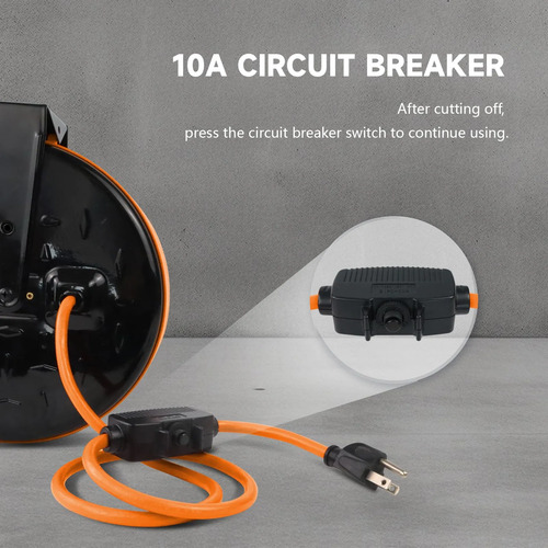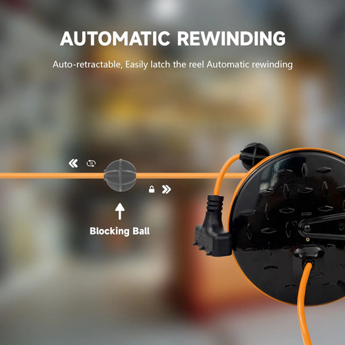 Retráctil automático: el carrete del cable de alimentación se puede retraer rápida y suavemente a través del mecanismo de rebobinado de guía automática, y el sistema de carraca puede bloquear cualquier longitud de cable.