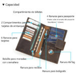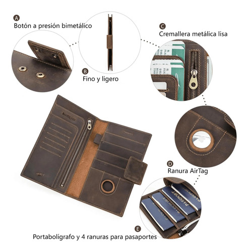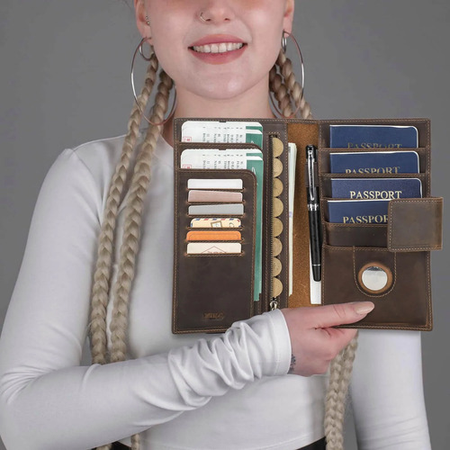 Interior multifuncional: Equipado con 4 bolsillos para pasaportes, 6 ranuras para tarjetas, 2 bolsillos para tarjetas de embarque, 2 compartimentos para billetes o dinero en efectivo, un bolsillo con cremallera para monedas, un bolsillo AirTag y un portabolígrafos, satisface las necesidades de almacenamiento organizado de todos los documentos de viaje de la familia