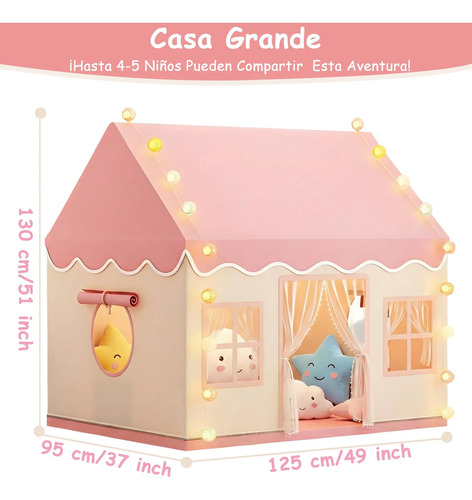 Espaciosa Casita de JuegosEsta espaciosa tienda de princesa mide 49x37x51 pulgadas y en ella caben cómodamente 4 o 5 niños. Este castillo infantil está hecho de tela duradera y fácil de limpiar cuenta con 4 ventanas para una excelente ventilación y le brinda a tu hijo una base secreta privada y cómoda.