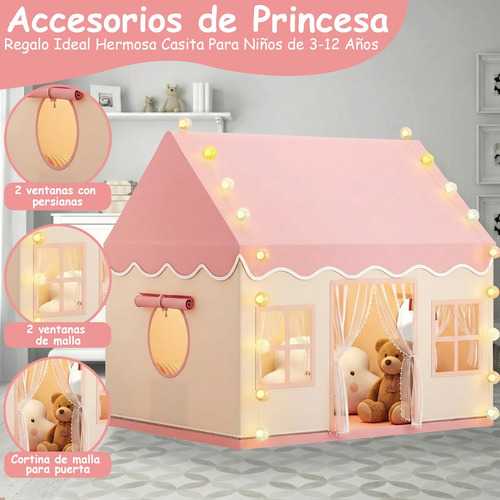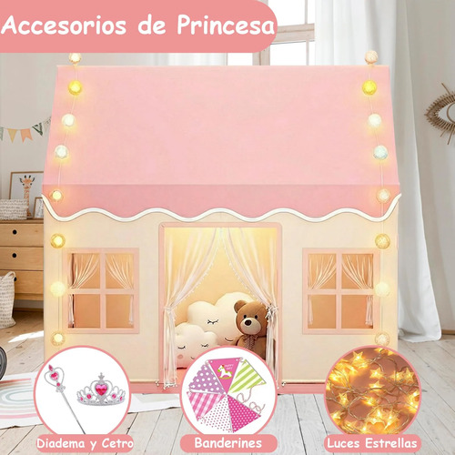 Tienda de PrincesaEste adorable castillo de princesas para niñas presenta una suave combinación de colores rosa y crema. Viene con luces de hadas, un set de varita de princesa y banderines, permitiendo que las niñas se disfracen fácilmente y hagan realidad su sueño de ser princesas. ¡Qué regalo tan lindo y práctico