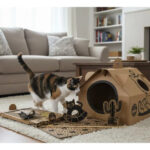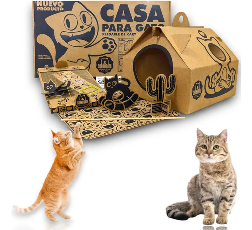 CASA PLEGABLE: Fabricada en cartón corrugado resistente, se arma y pliega fácilmente, ofreciendo a tu gato un refugio seguro, cómodo y acogedor donde podrá descansar y sentirse protegido. Un espacio propio que reduce el estrés y mejora su calidad de vida.