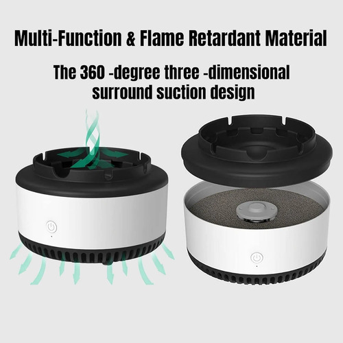 Diseño multifuncionalEste cenicero portatil tiene múltiples usos. No sólo recoge el hollín, sino que también actúa como purificador de aire, eliminando partículas de humo y otros contaminantes. Es una solución versátil y conveniente tanto para fumadores como para no fumadores.