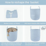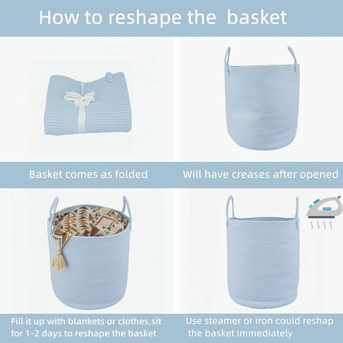 Nota: la cesta de lavandería viene doblada y puede tener arrugas. Llenar completamente la cesta de lavandería con toallas o ropa y esperar de 1 a 2 días ayudará a remodelar la cesta de lavandería. También puedes utilizar vapor o planchado para remodelar la cesta de lavandería. La cesta de cuerda es lavable a máquina. Si se lava a máquina la cesta de lavandería, por favor ponla en una bolsa de lavado para prendas delicadas y sécala al aire.