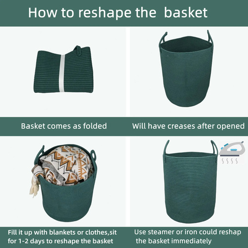 Ten en cuenta: La cesta para ropa viene doblada y puede tener arrugas. Llenar completamente la cesta con toallas o ropa y esperar 1-2 días ayudará a que recupere su forma. También puedes utilizar vapor o planchar para recuperar la forma de la cesta de ropa. La cesta de cuerda es lavable a máquina. Si se lava a máquina la cesta de ropa, por favor, ponla en una bolsa de lavado para ropa delicada y sécala al aire.