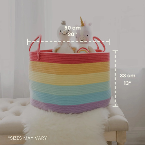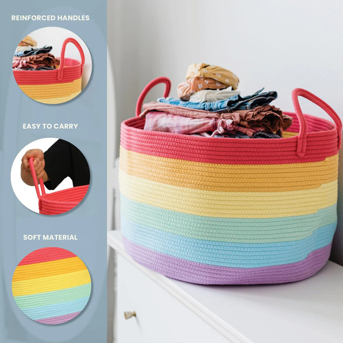 Convierte el desorden en alegría Cesto grande de almacenamiento tejido en tonos arcoíris que aportan color y calidez a cualquier cuarto de bebé, habitación infantil o sala de juegos. Ideal para organizar juguetes, ropa de bebé o mantas, manteniendo tus espacios acogedores y ordenados.