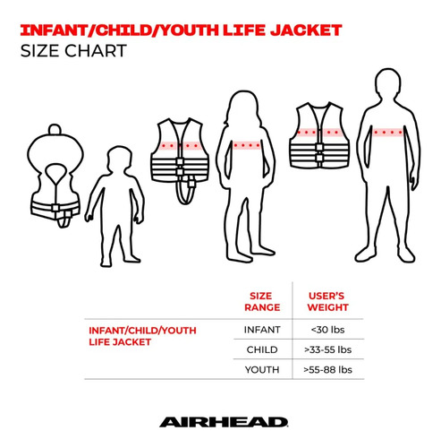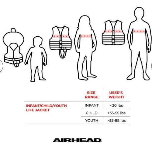 SIZING – This life jacket follows the sizing determined by the USGC. CHILD is USCG Type III for children weighting 30-50 pounds, INFANT is USCG Type II for under 30 pounds